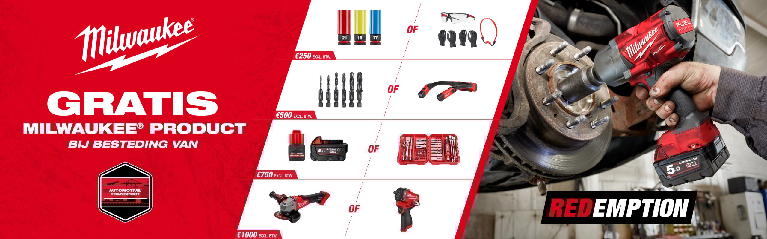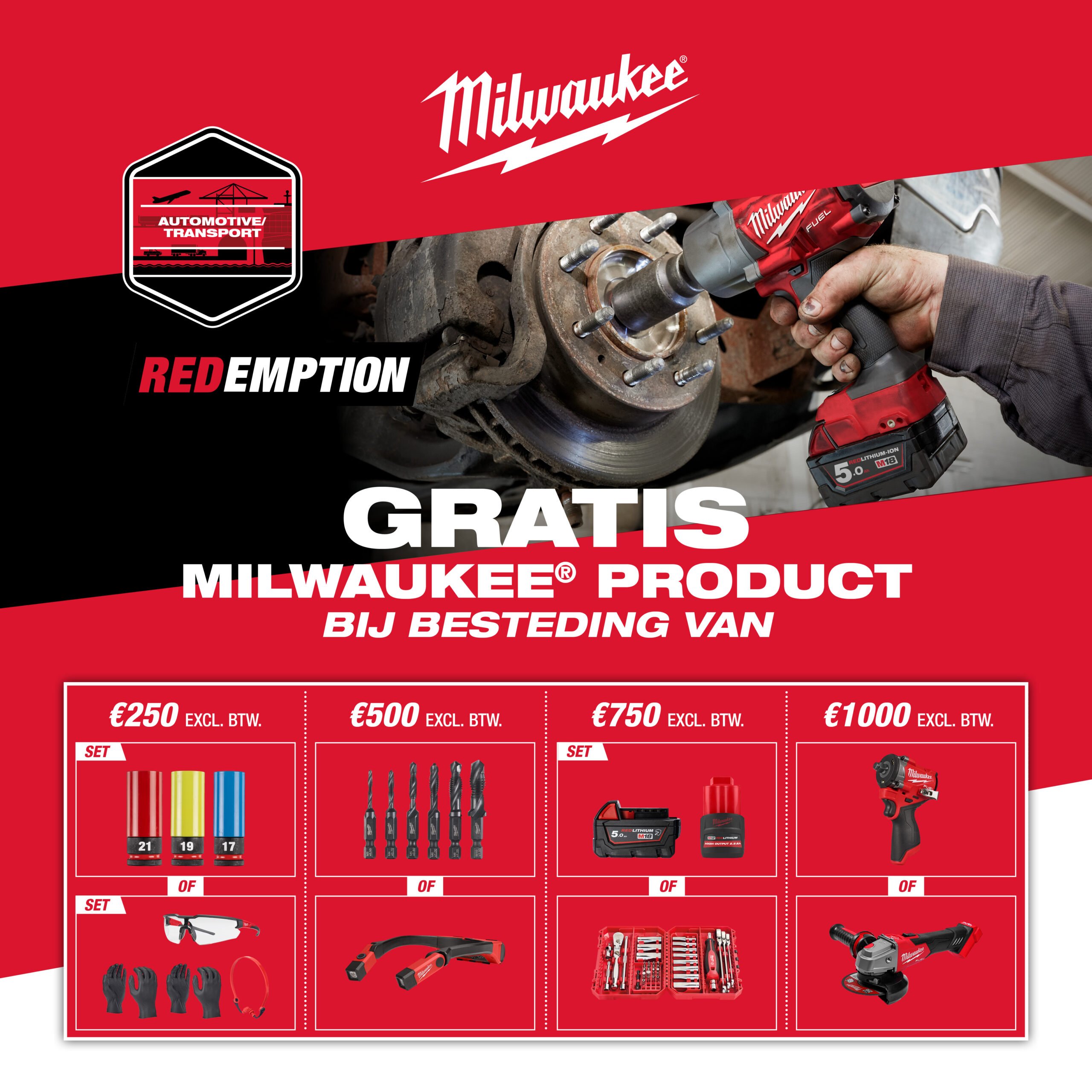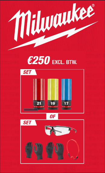 Bij besteding vanaf 250 euro of meer aan Milwaukee producten kan je vanaf 1 oktober gratis producten claimen! Hoe hoger je aankoopbedrag, hoe groter de beloning die je kunt kiezen!