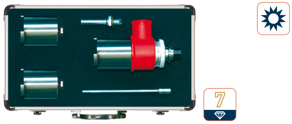Basis adaptor, stofafzuiging aansluiting, 2x snelwisselopname, uitdrijfdoorn, centreerboorhouder en centreerboor en 3 dozenboren 82mm in aluminium koffer.