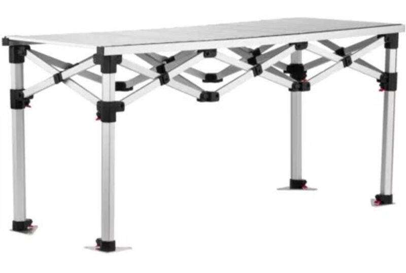 Duurzaamheid: Gemaakt met hoogwaardig aluminium voor duurzaamheid en eenvoudig onderhoud. Het tafelblad is bestand tegen slijtage, ideaal voor intensief gebruik op markten of tijdens kampeertrips.