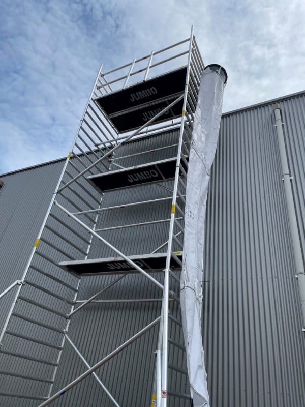 Met een maximale lengte van 27 meter biedt deze slurf een grote reikwijdte, waardoor het puin eenvoudig van hoger gelegen plaatsen naar beneden kan worden geleid.