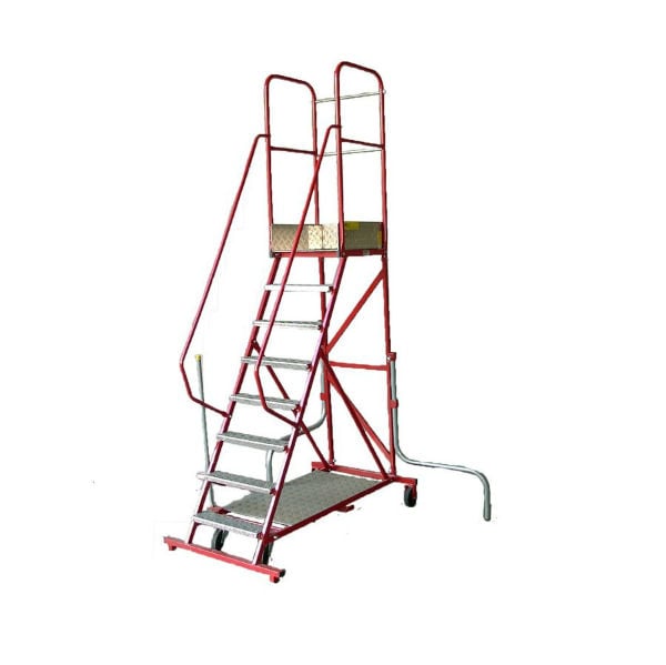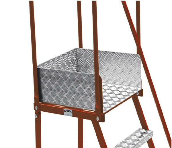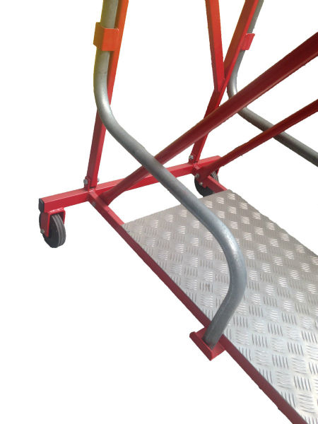 Een robuuste stalen bordestrap voorzien van aluminium tranenplaat treden, schoprand op het bordes, hoge leuningen, wegklapbare stabilisatoren (waardoor hij ook in smallere/kleinere ruimtes te gebruiken is) en een unieke hefboomrem.