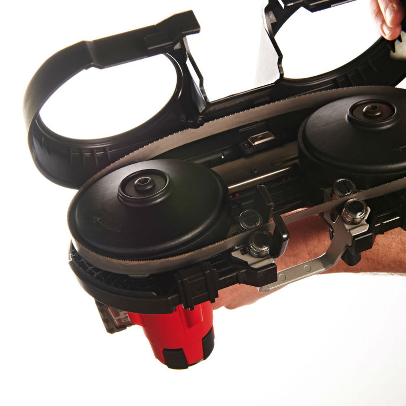 – Volledig gesloten beschermkap – nieuw afdeksysteem voor de zaagband ter bescherming van de gebruiker tegen letsel bij het verwisselen van de zaagband