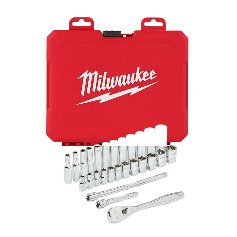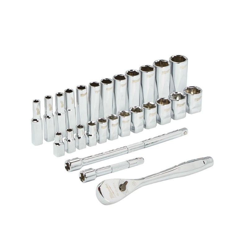 Standard sockets: 5 mm, 5.5 mm, 6 mm, 7 mm, 8 mm, 9 mm, 10 mm, 11 mm, 12 mm, 13 mm, 14 mm, 15 mm Deep well sockets: 5 mm, 5.5 mm, 6 mm, 7 mm, 8 mm, 9 mm, 10 mm, 11 mm, 12 mm, 13 mm, 14 mm, 15 mm